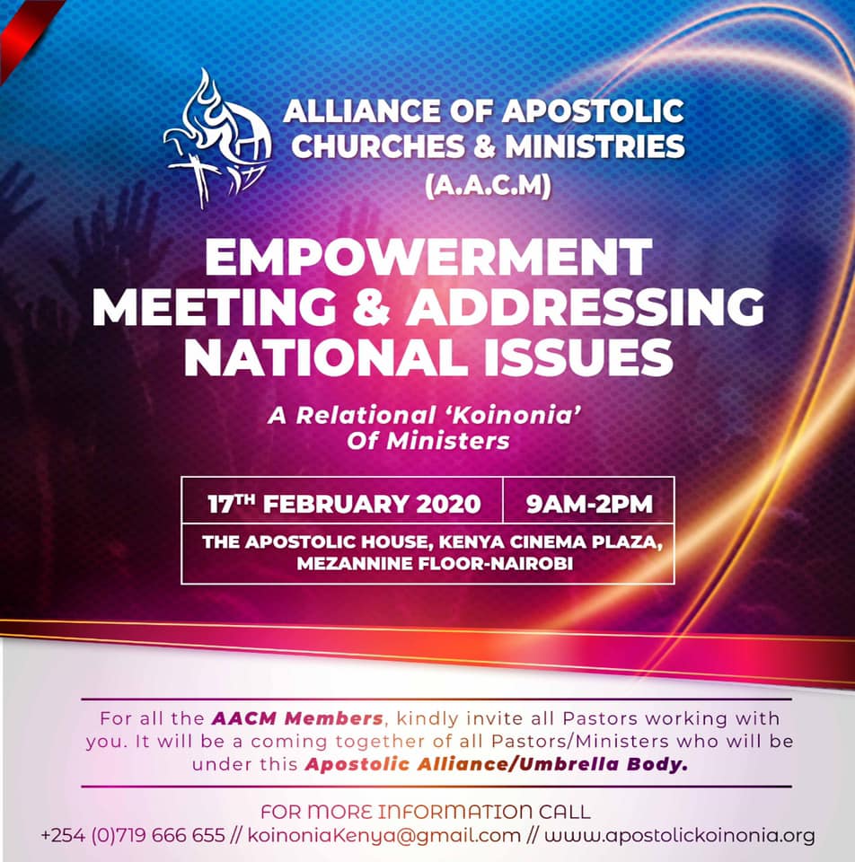 The Alliance of Apostolic Churches and Ministries (AACM) extends a warm invitation to Fivefold Ministers – Apostles, Prophets, Evangelists, Pastors, and Teachers – for a morning of empowerment, envisioning, and ‘Koinonia’ at the Apostolic House in Nairobi. Set to take place on Monday, 17th February, the event promises to be a transformative experience from 9:00 am to 2:00 pm.